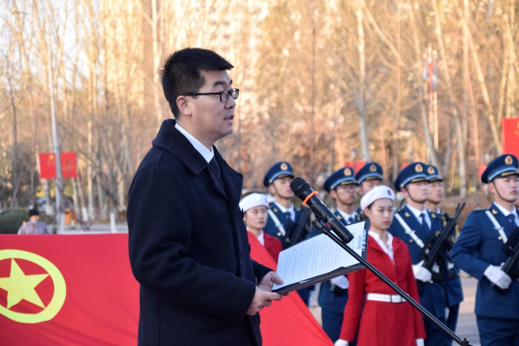 自动化学院实践部部长、尖兵队礼兵分队副队长张坤同学作为学生代表发言。他为圆蓝天梦想考入沈航这所东北唯一一所以航空航天为特色的综合性大学。沈航的航空航天精神和深厚的国防军工情怀,点燃了他航空报国的激情和斗志。他努力成为一名国旗护卫队员,用挺拔的身姿、标准的动作、铿锵的步伐为菁菁校园那抹最美空军蓝增添更靓丽的色彩!他倡议沈航学子要秉承校风校训,深植弘扬六十七年以来沈航人立志蓝天、献身国防的深厚军工国防情怀,为实现沈航人的蓝天梦、人民军队的强军梦、民族复兴的中国梦而砥砺前行,拼搏奋斗,在新时代中国特色社会主义奋进的征途上书写属于沈航人的绚丽诗篇!