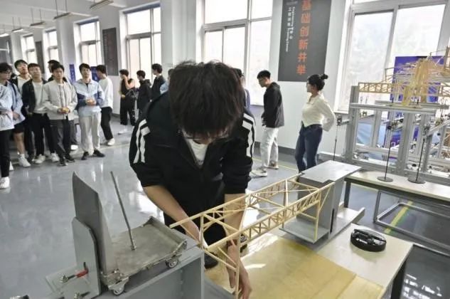 会后,参会的师生进入实验室,参观学习了今年桥梁结构大赛的项目,汪老师细致介绍了关于2023年结构大赛的情况。并由参赛队员向同学们演示桥梁加载过程,俱乐部成员设计的桥梁经过了10秒钟标准加载后,依然稳如泰山,没有任何损坏,在场同学为之欢欣鼓舞。