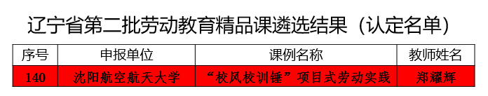 近日,由辽宁省委教育工委组织开展的劳动教育精品课遴选结果揭晓,学校工程训练中心申报的“校风校训锤”项目式劳动实践被认定为“辽宁省第二批劳动教育精品课”。本次遴选经各市、各高校推荐、专家工作组评议、厅长办公会审议通过,认定省级劳动教育精品课148节,培育省级劳动教育精品课112节。