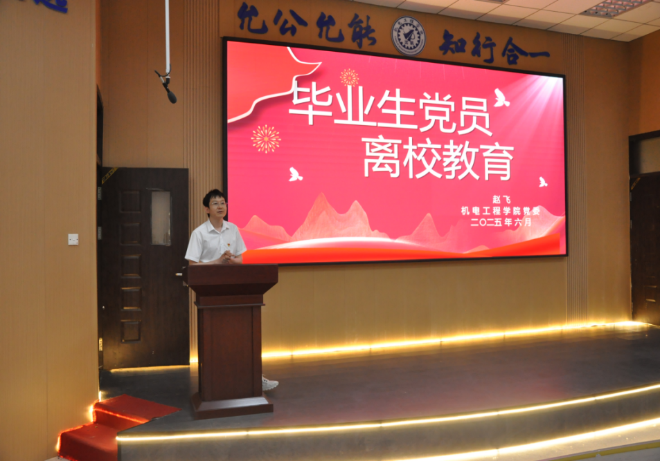 2025年6月10日,机电工程学院党委在机械馆一楼报告厅召开了2025届毕业生党员离校教育。本次主题活动由党委组织员赵飞主讲。