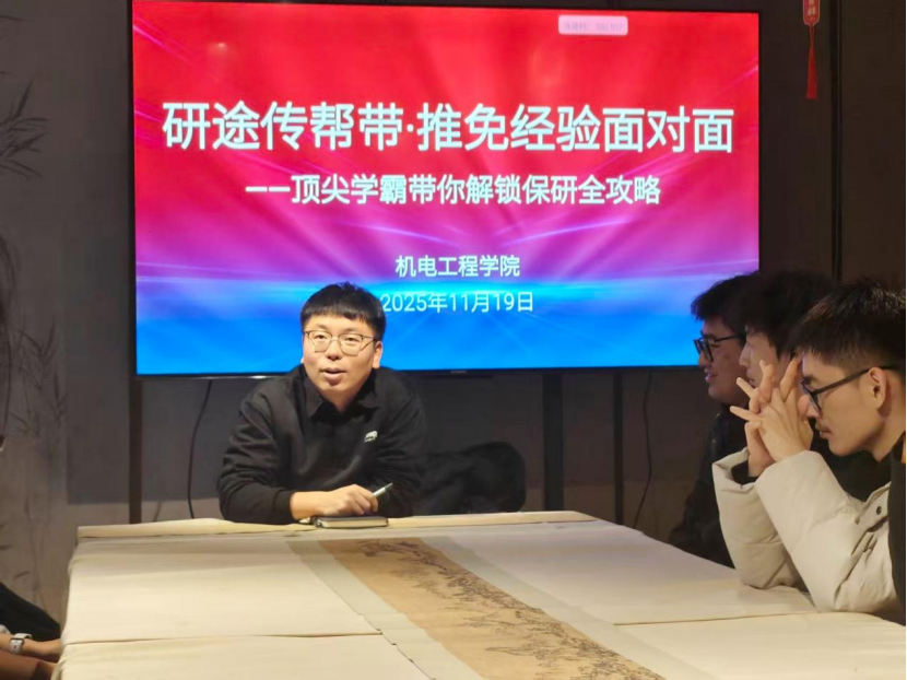 为充分发挥朋辈榜样的引领作用,帮助同学们明晰保研路径、科学规划学业,11月19日,机电工程学院在“一站茶坊”成功举办“研途传帮带・推免经验面对面”榜样分享会。活动由2024级辅导员赵重光主持,王书诚、谢佩嘉、熊伟杰、王鸿慧等4名成功推免至知名高校的优秀学长倾囊相授,15名2024级、2025级本科生现场沉浸式取经,共赴一场干货满满的“保研赋能之旅”。